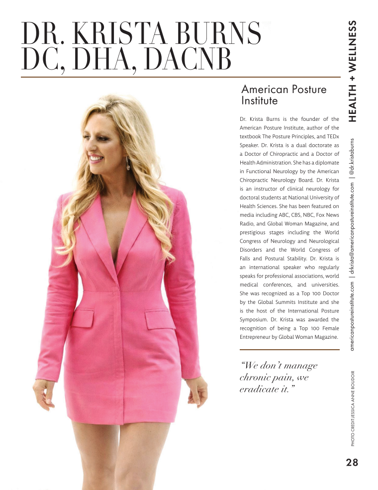 Dr. Krista Burns is the founder of the American Posture Institute, author of the textbook The Posture Principles, and TEDx Speaker. Dr. Krista is a dual doctorate as a Doctor of Chiropractic and a Doctor of Health Administration. She has a diplomate in Functional Neurology by the American Chiropractic Neurology Board. Dr. Krista is an instructor of clinical sciences for doctoral students at National University of Health Sciences teaching clinical neurology.